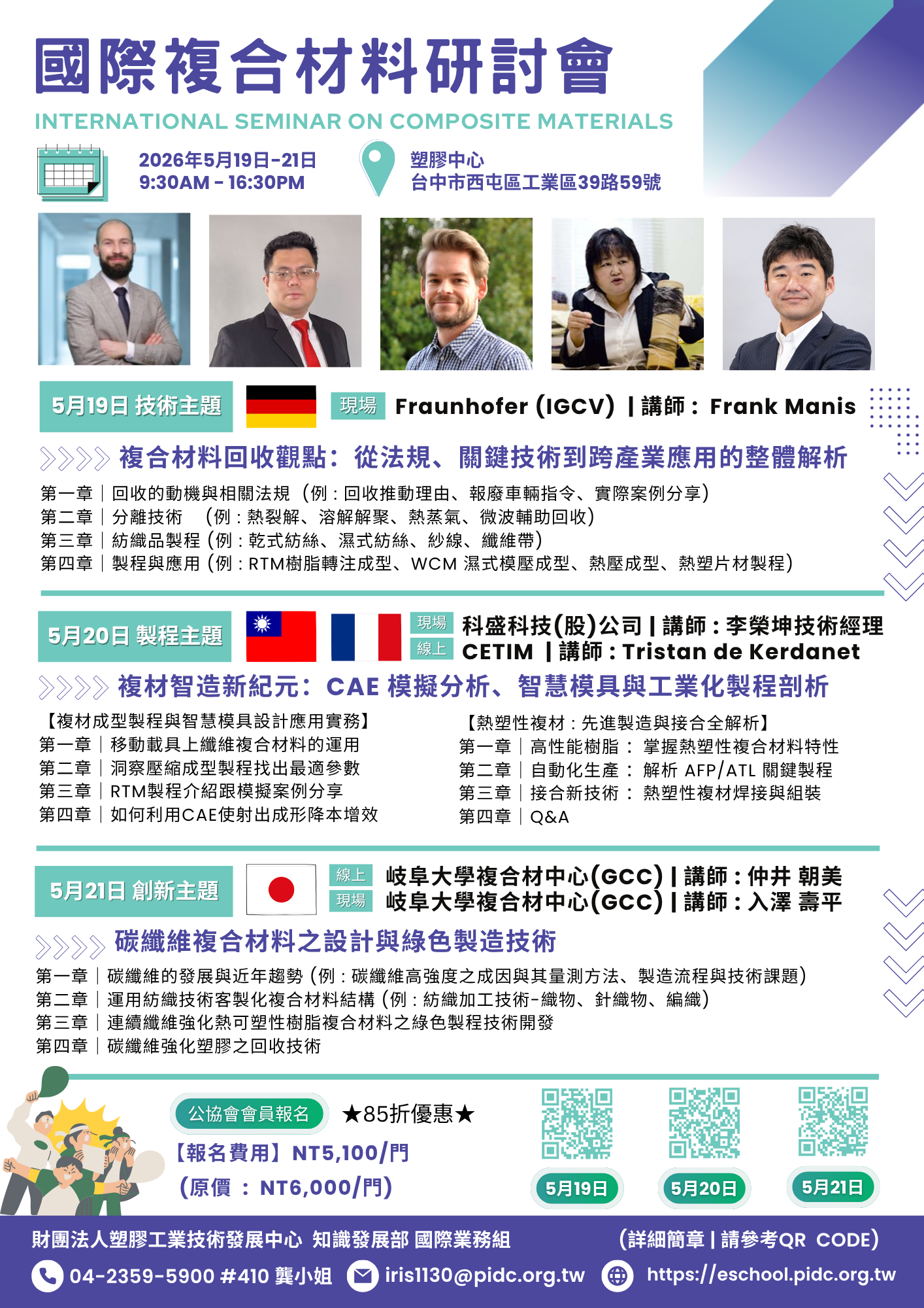 為了協助國內業者突破技術瓶頸,財團法人塑膠工業技術發展中心(PIDC)將於115年 5月19日~5月21日舉辦「國際複合材料研討會」,特邀德、日、法國際複材專家,深入探討產業關鍵趨勢。
